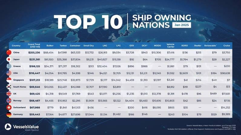 国际知名航运数据机构VesselsValue近日发布《2025年全球十大船东国榜单》,按船队总资产价值(含现役及订单船舶)对各国船东实力进行排名。中国首次超越日本,以2550亿美元的总价值跃居榜首,首次成为全球第一大船东国。希腊、美国分列第三、第四位,瑞士时隔多年重返前十,德国排名持续下滑。这一变化标志着全球航运格局的重大调整,也反映出中国在散货船和集装箱船市场上的持续增长。