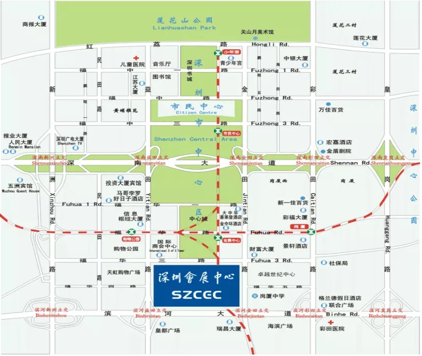 由罗湖、福田、盐田区出发:经滨河路或深南大道向西行,至金田立交处右转向北即抵达福华三路。